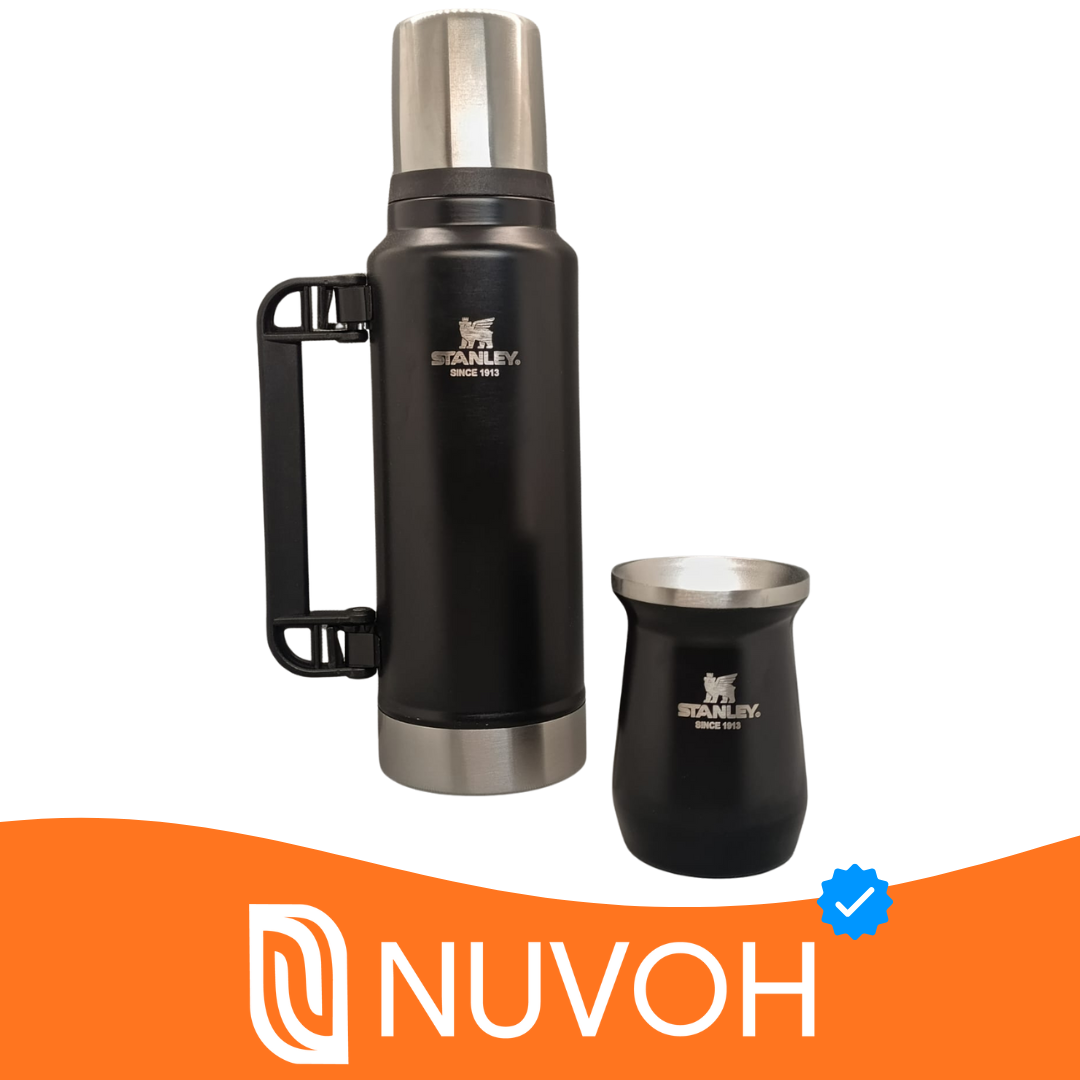 El legendario Termo Stanley de 1.2 litros, en un elegante acabado negro mate con manija robusta, mantiene tu agua caliente hasta por 32 horas, ideal para compartir incontables rondas de mate. Complementando la experiencia, el Mate Stanley de acero inoxidable, también en negro mate, asegura que tu bebida se mantenga a la temperatura ideal mientras disfrutas. Un dúo diseñado para durar toda la vida y acompañarte en cada aventura.