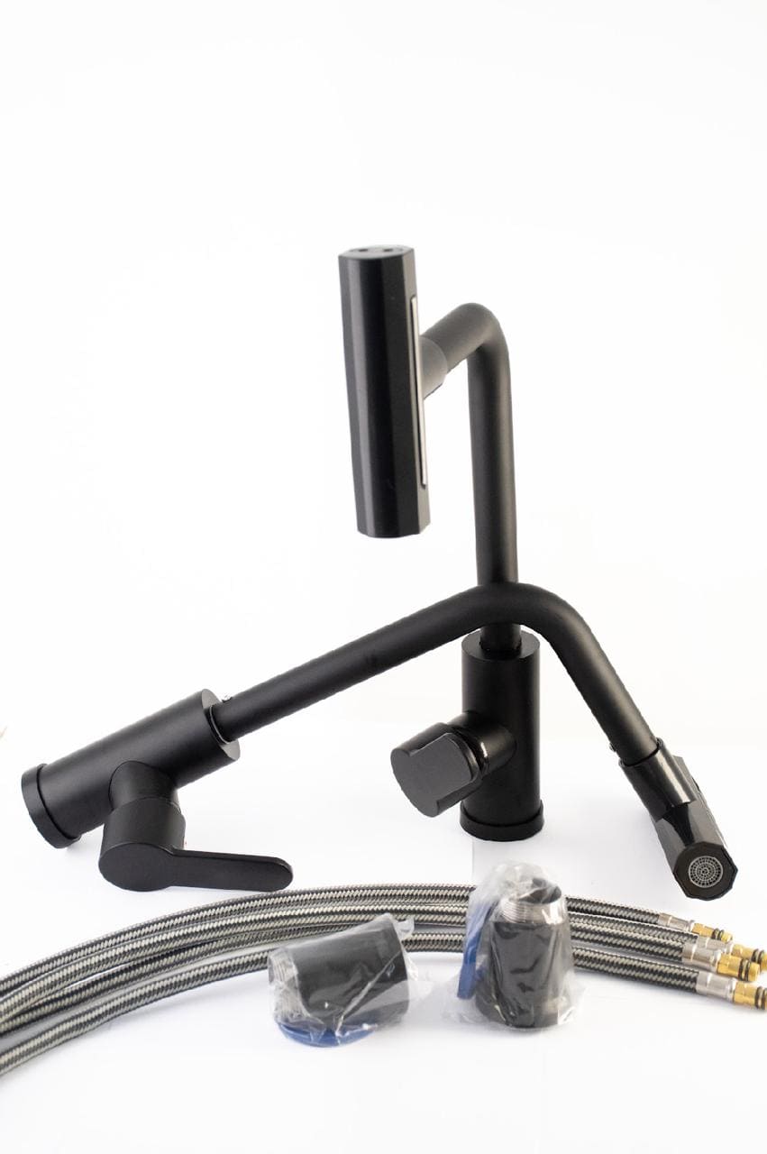 Grifería monocomando de cocina con diseño moderno y pico de 4 salidas de agua, ideal para quienes buscan funcionalidad y estilo en un solo producto. Su estructura articulada permite ajustar la dirección del agua fácilmente, brindando practicidad en cada uso. Fabricada en acero inoxidable con acabado negro mate, resistente a la corrosión y fácil de limpiar. Perfecta para cocinas contemporáneas que combinan diseño y eficiencia.