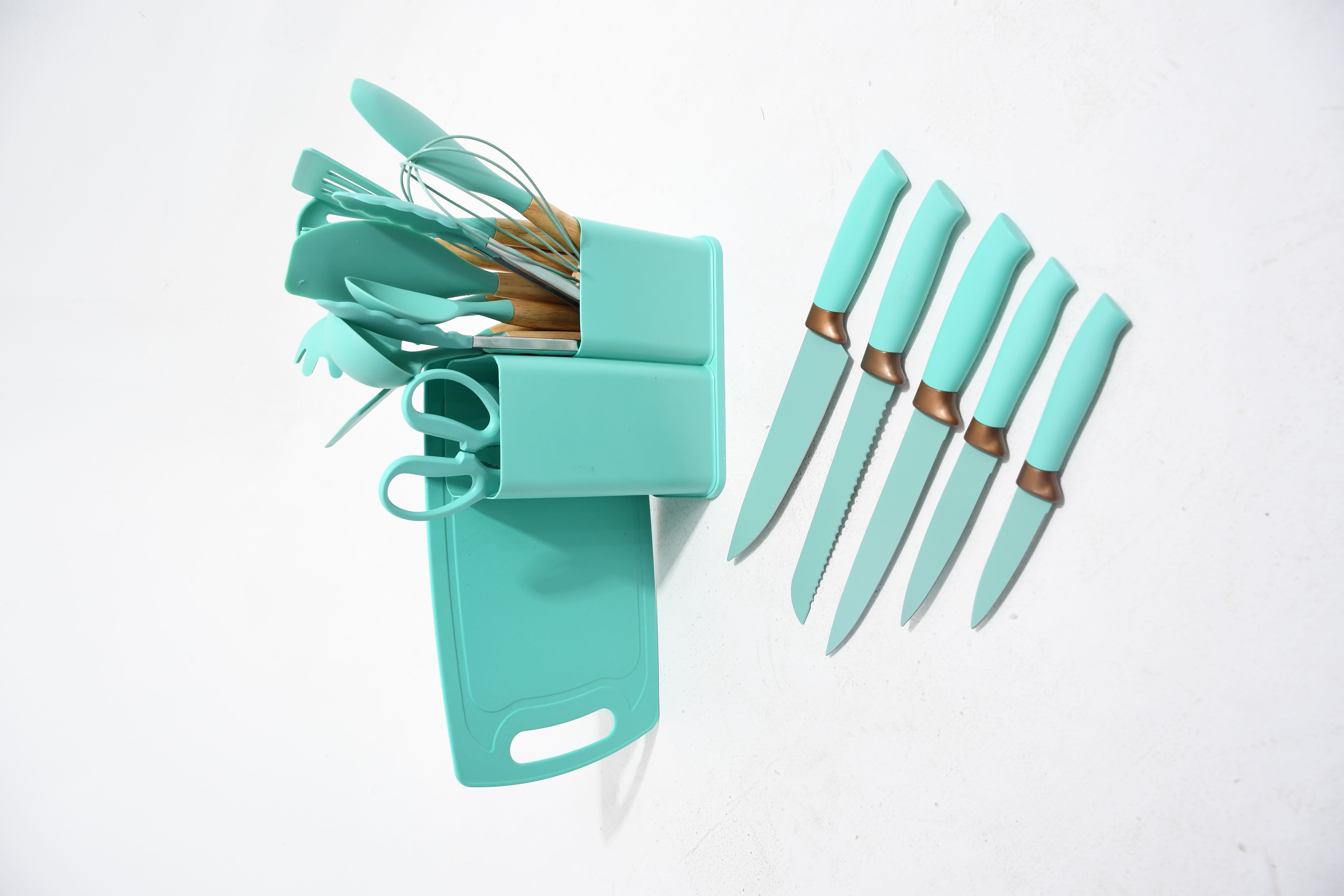 Incluye: Cucharón, espátula, pinza, batidor, cucharas medidoras, pelador, tijera y cuchillos