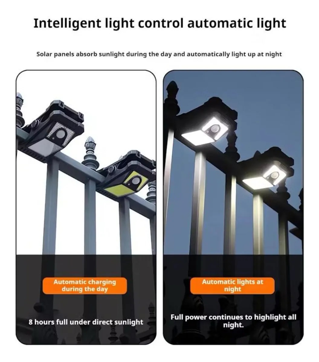 * Ilumine Sin Esfuerzo su Espacio Exterior con nuestras Luces de Carga Solar o USB que Detectan Suavemente el Mmovimiento dentro de los 3 metros y Cambian al Modo de Alto Brillo. Inteligente y Ecológico.