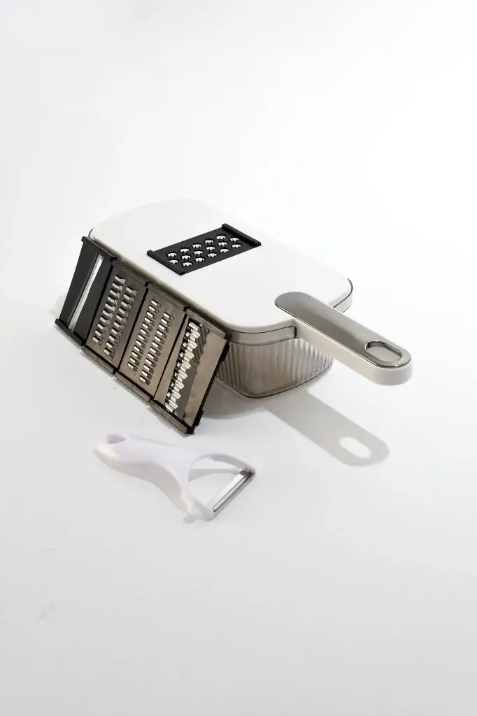 Este práctico picador combina funciones de mandolina y rallador, facilitando la preparación de verduras con diferentes texturas y cortes.