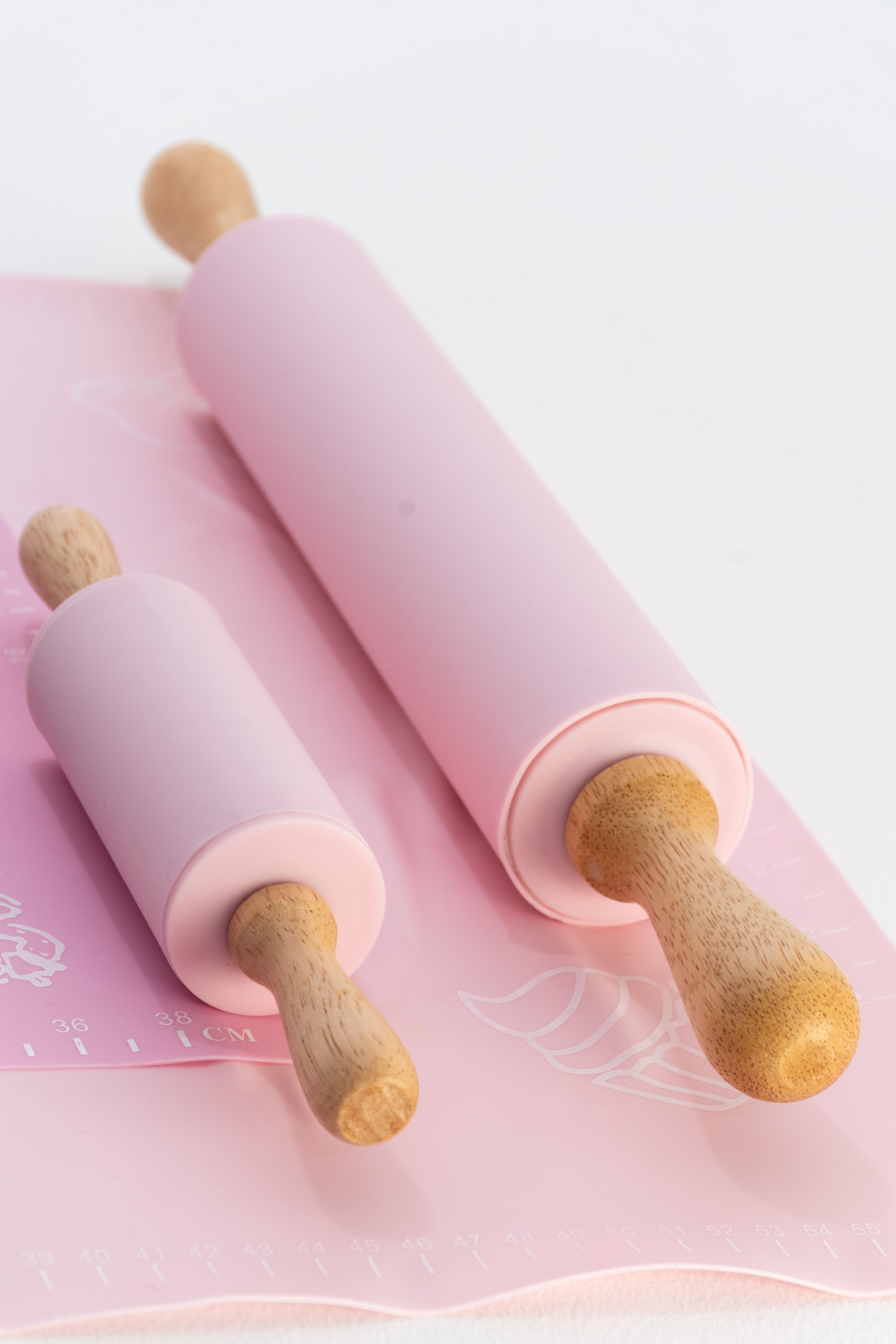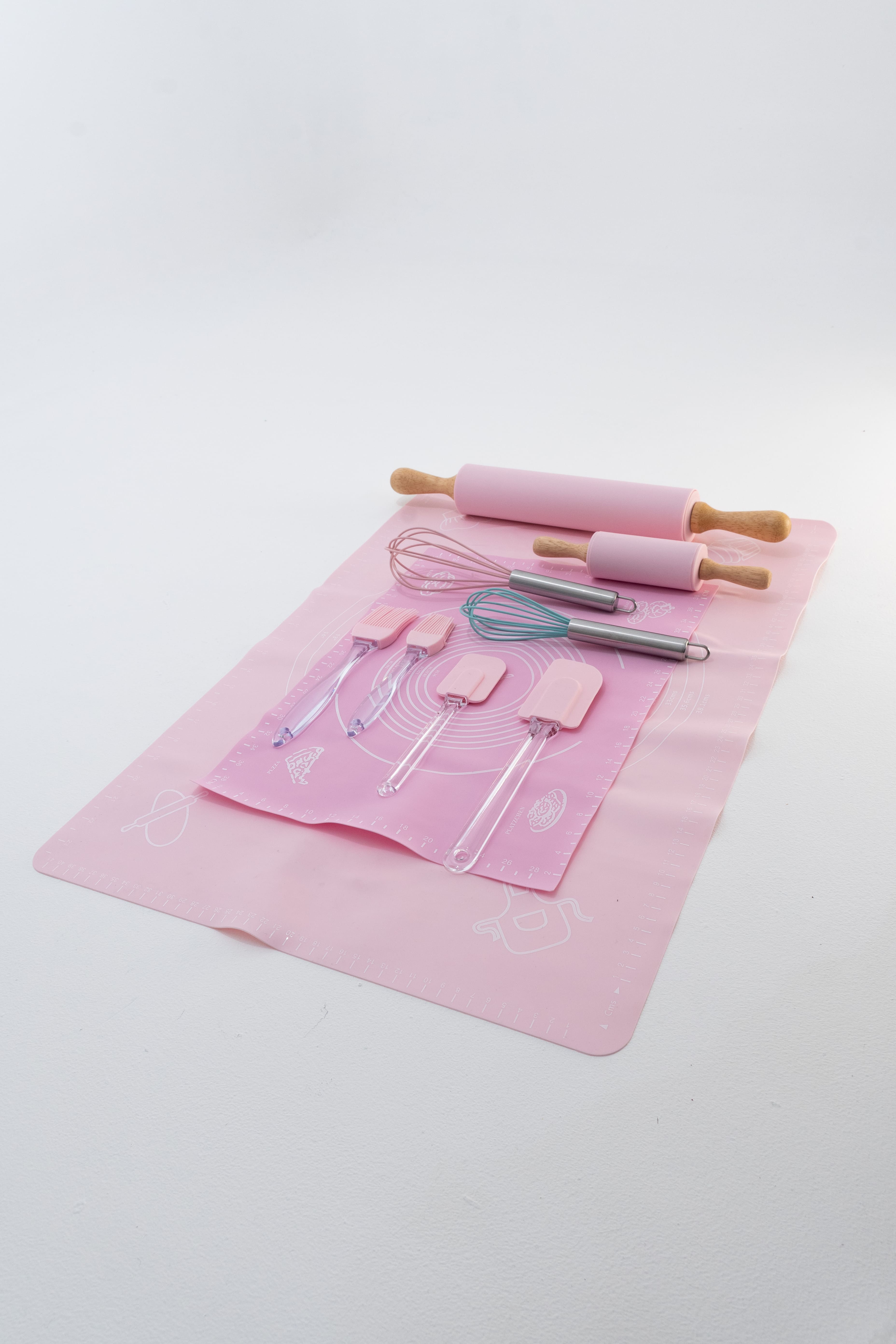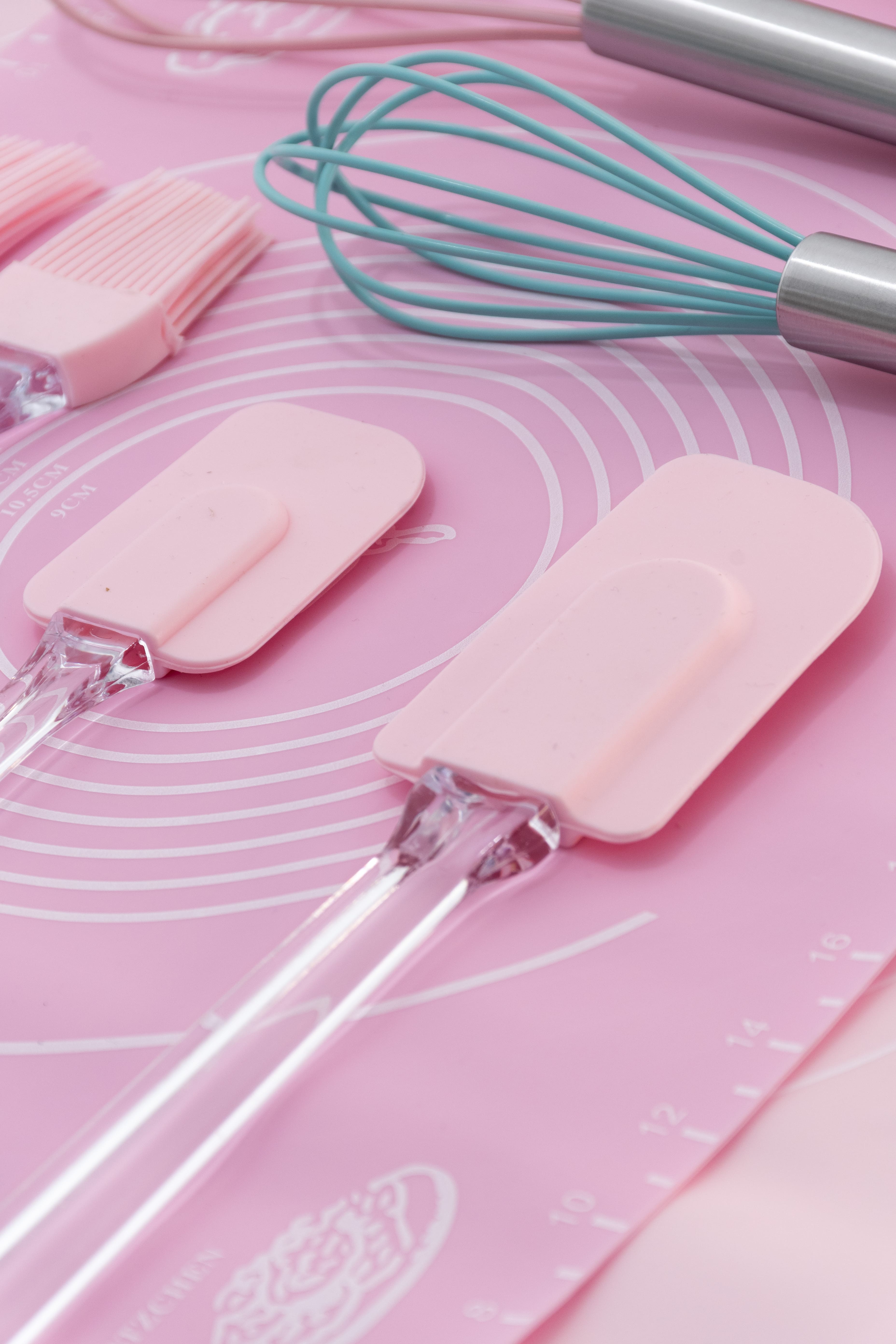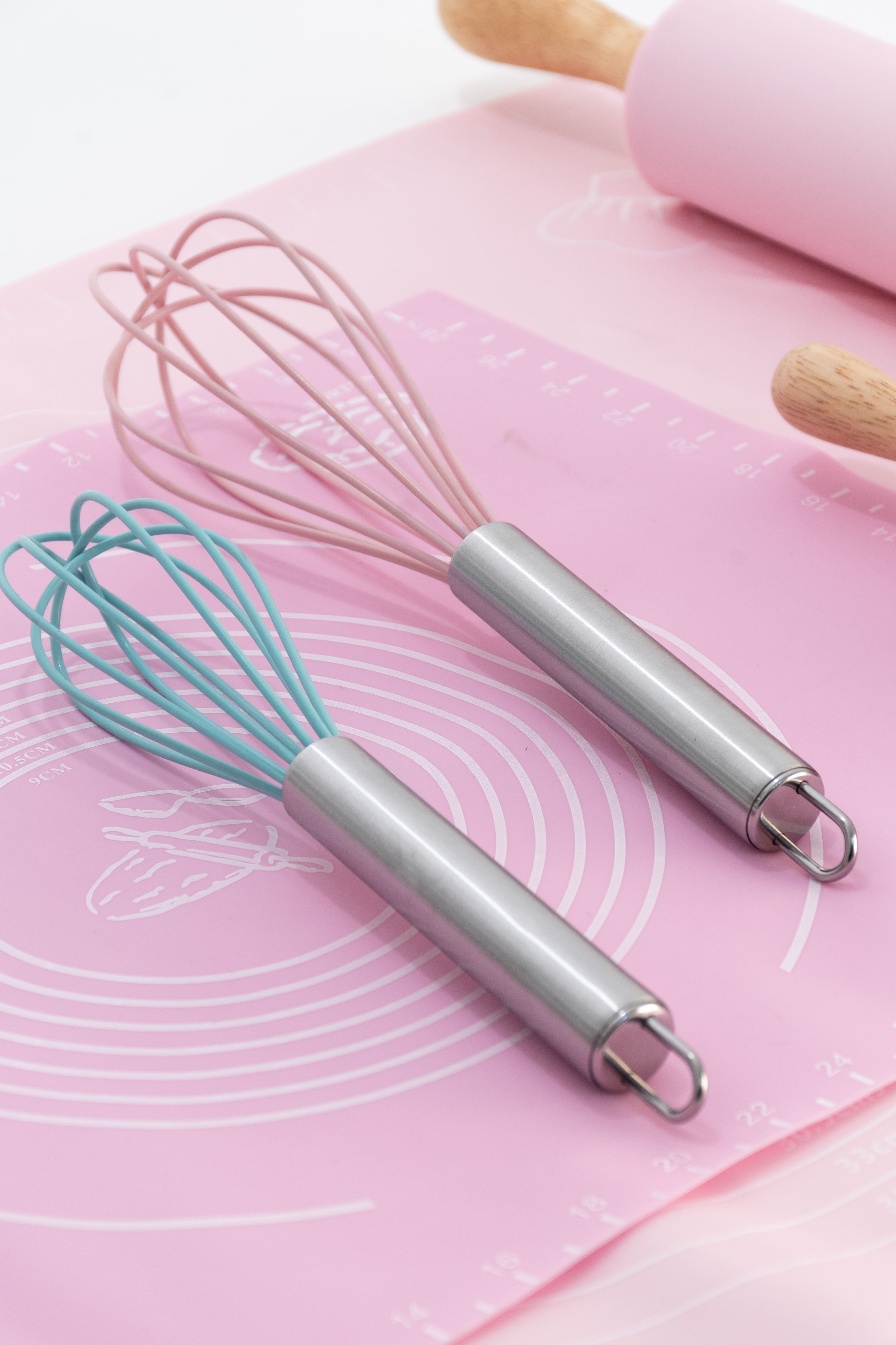 - Incluye: 2 espatulas (1 pequeña y otra grande), 2 batidores (1 pequeño y otro grande), 2 pinceles (1 pequeño y otro grande), 2 palos de amasar (1 pequeño y otro grande) y 2 invidivuales (1 pequeño y otro grande).